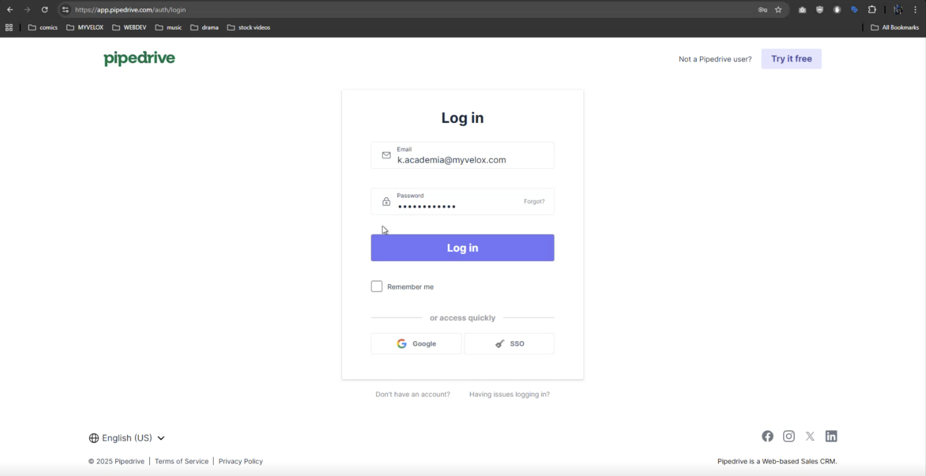 To integrate Velox with Pipedrive, ensure that your CRM or Pipedrive credentials are ready to use for login.