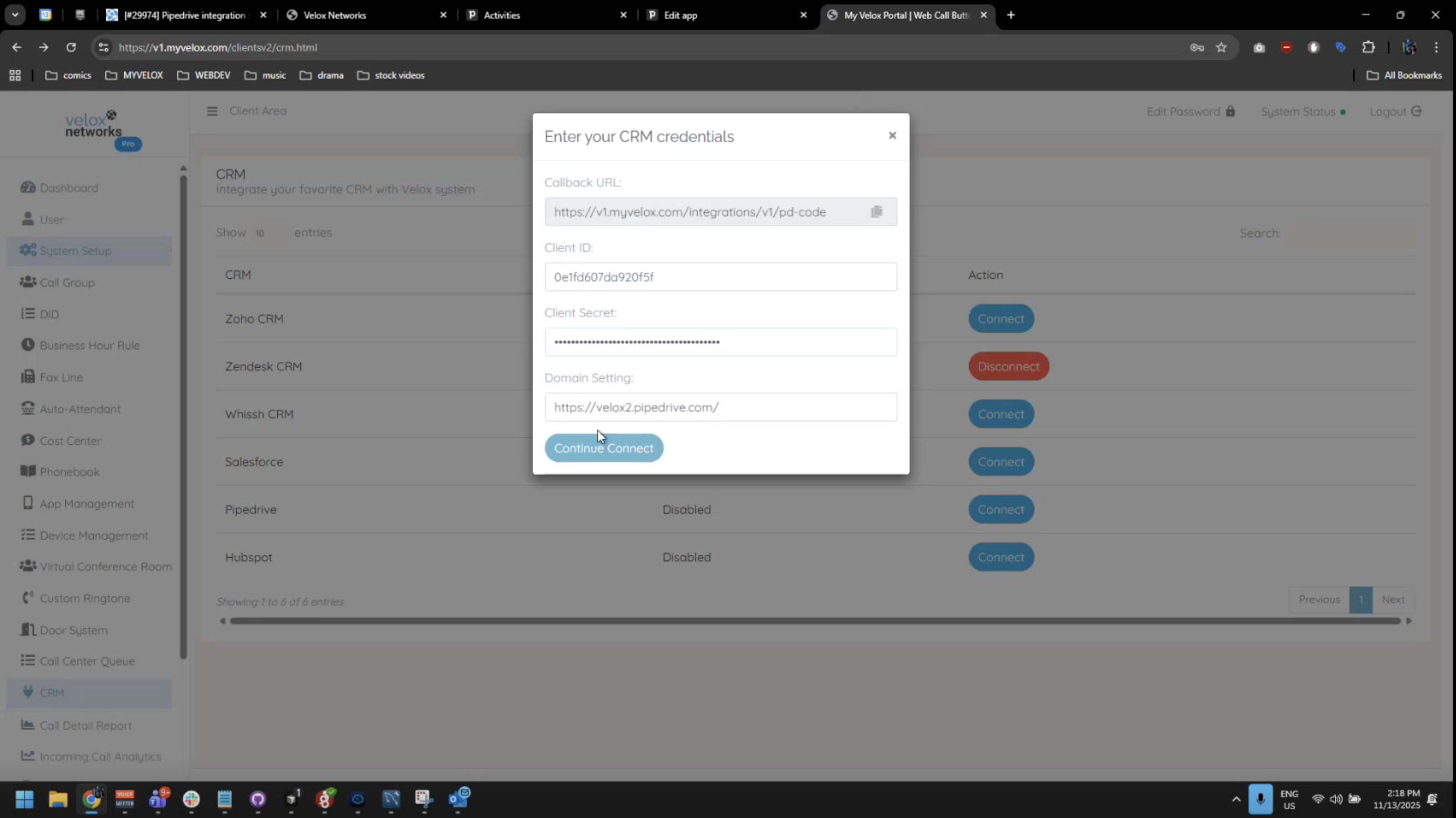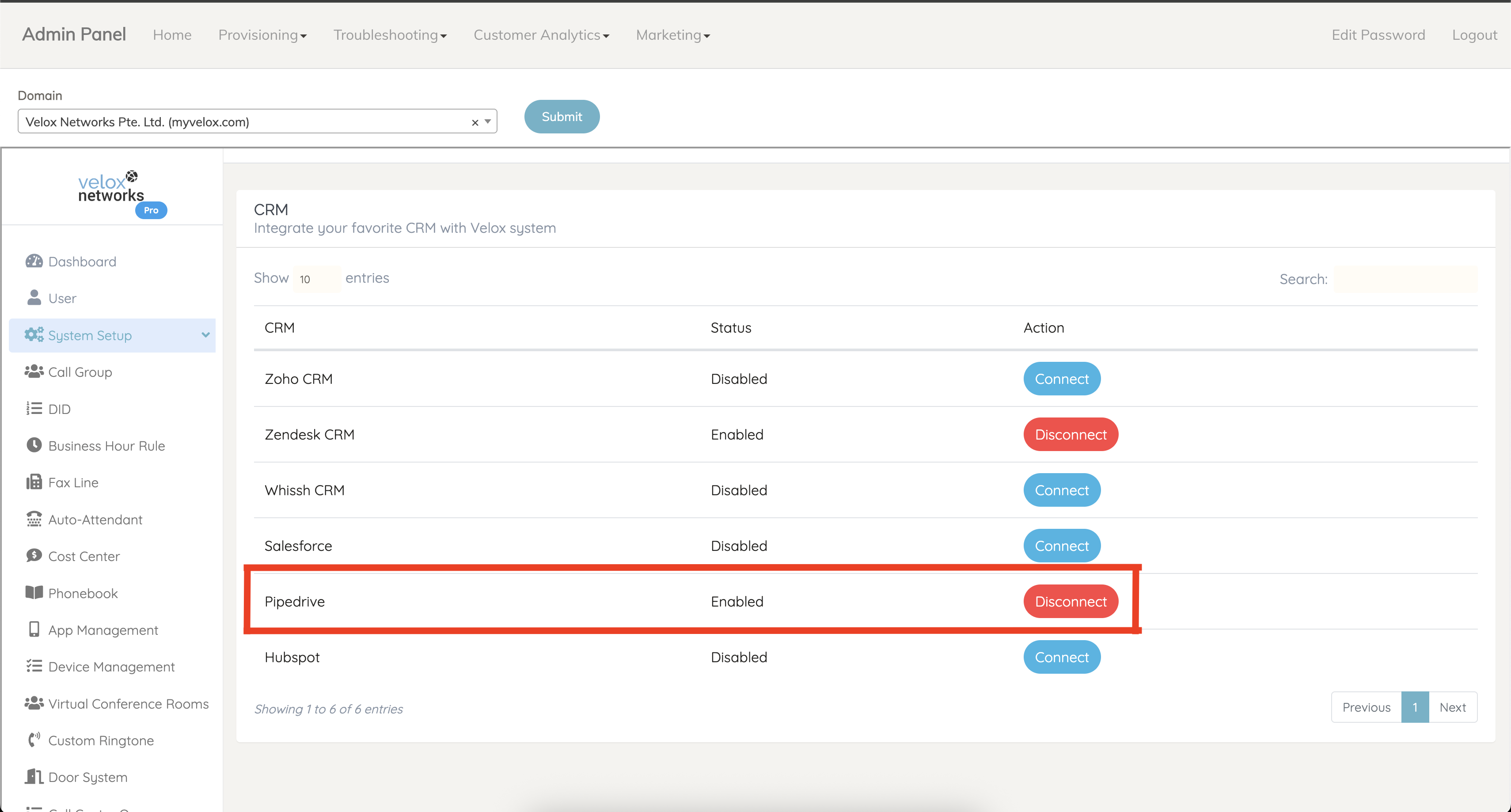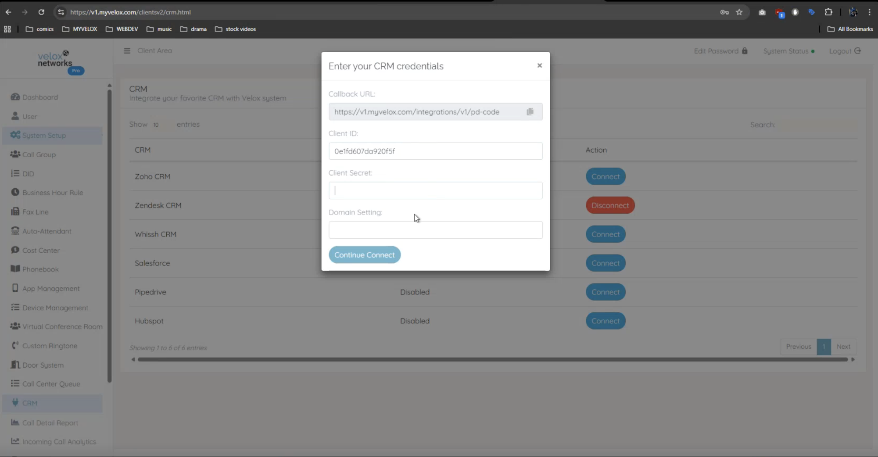 2. In the Velox dashboard, go to system setup > CRM and click the “connect” button for Pipedrive