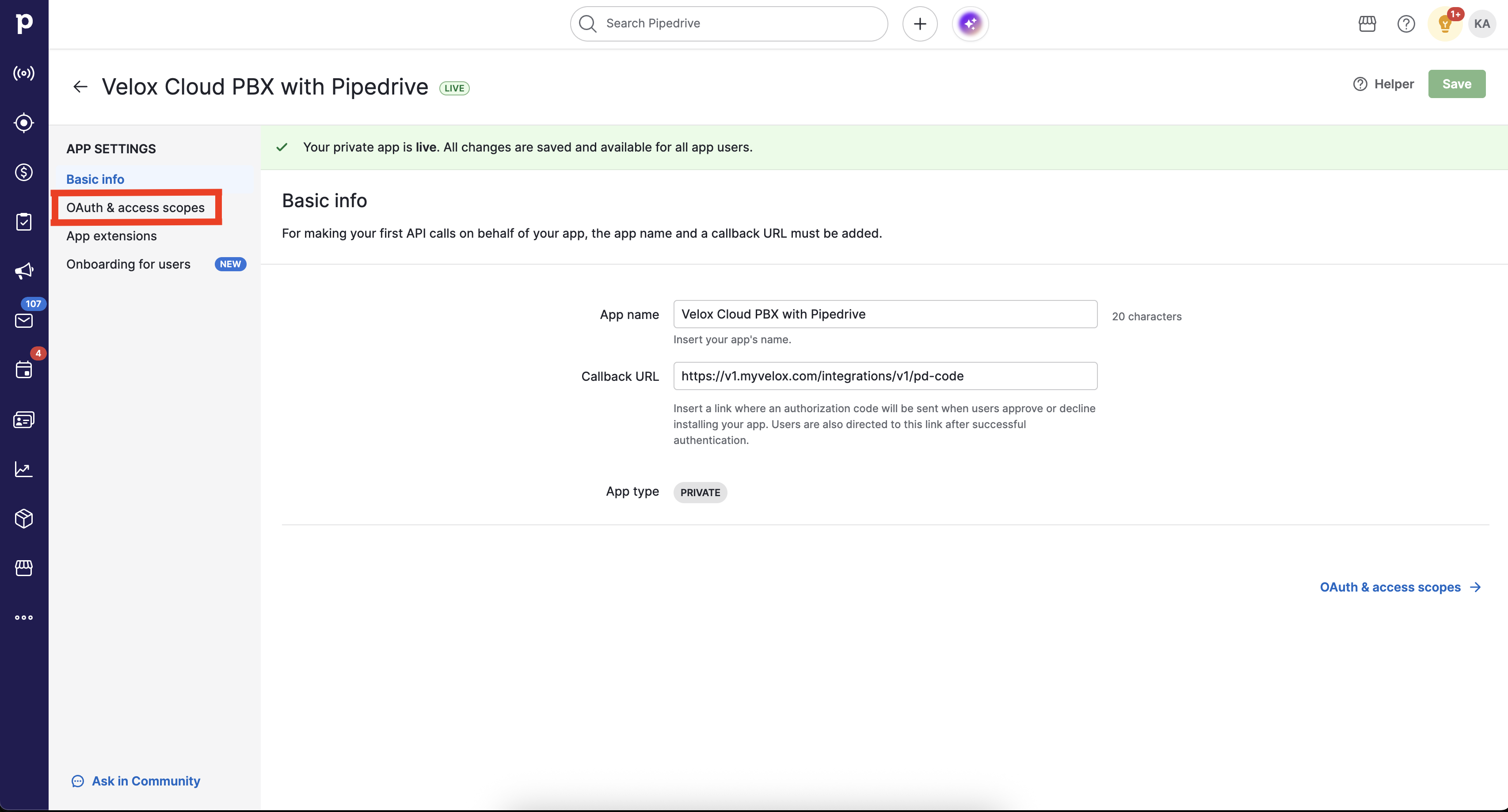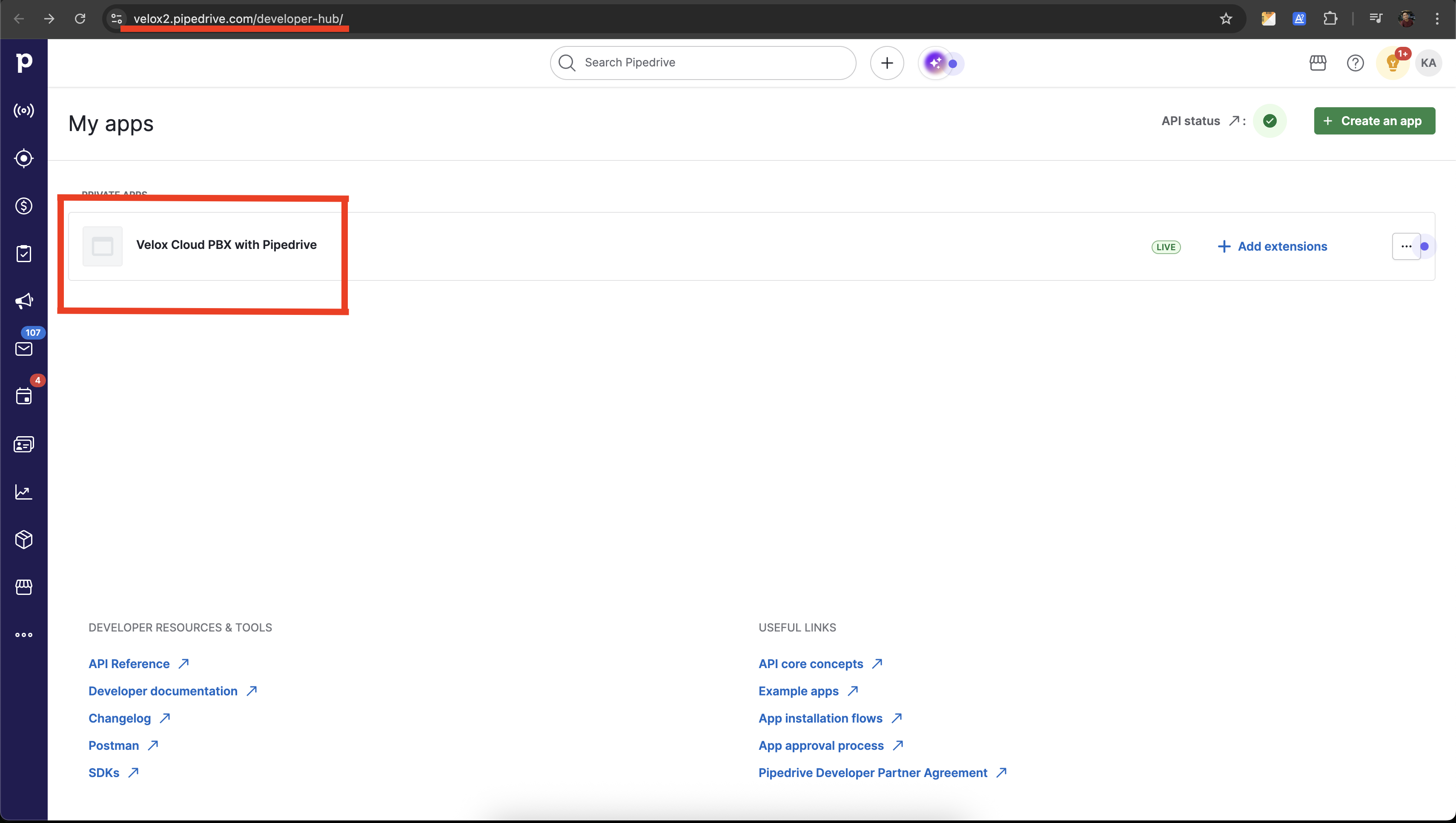 4. To locate the mentioned credentials, navigate to this link:https://velox2.pipedrive.com/developer-hub/ (make sure that you are logged in to Pipedrive.)