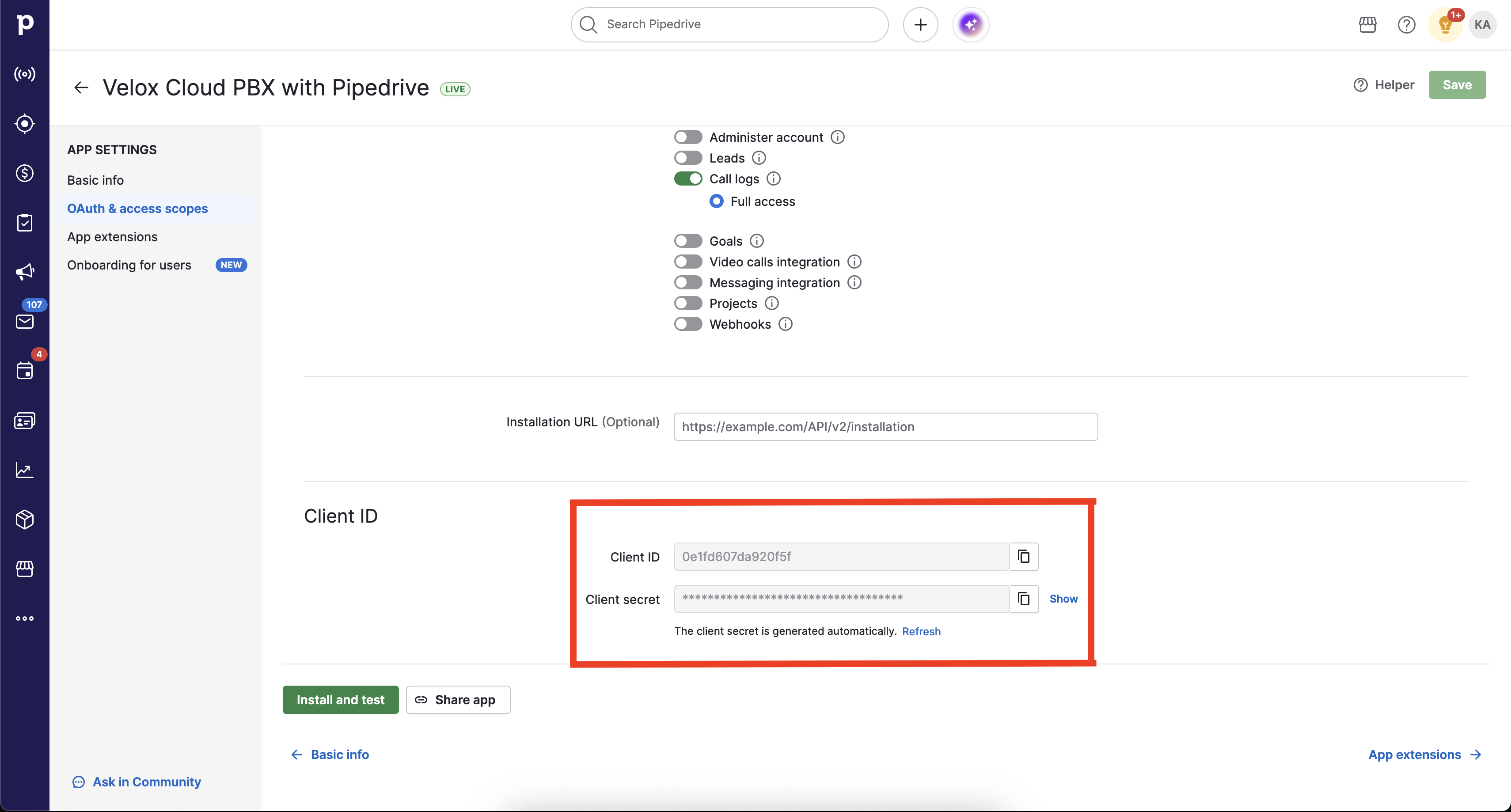 7. On the bottom part of the page, you will see the Client ID & Client Secret. Go back to the Velox dashboard and paste it in the designated field.
